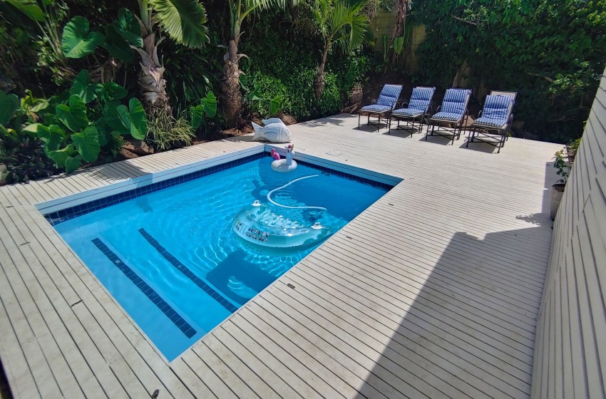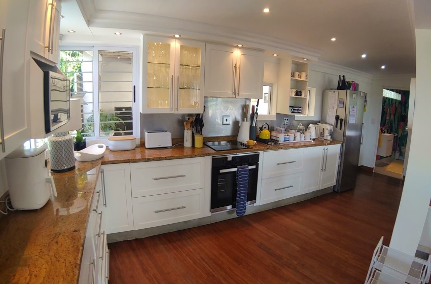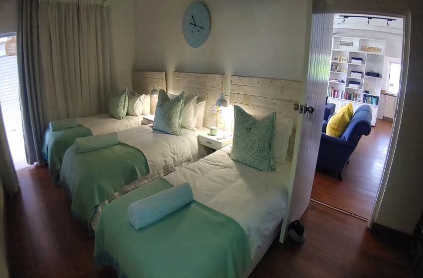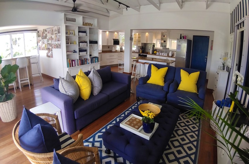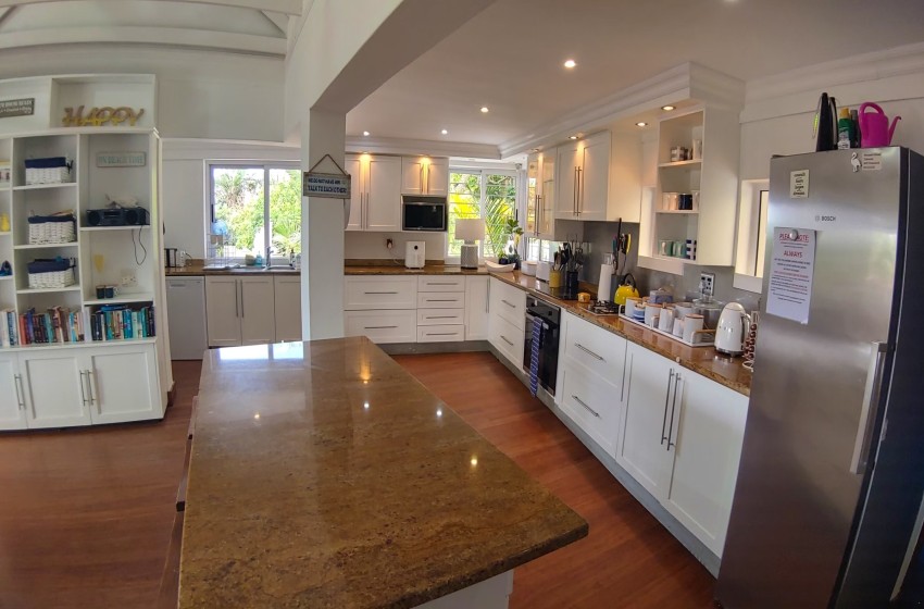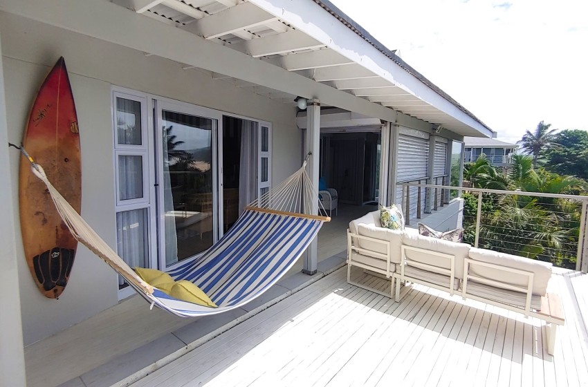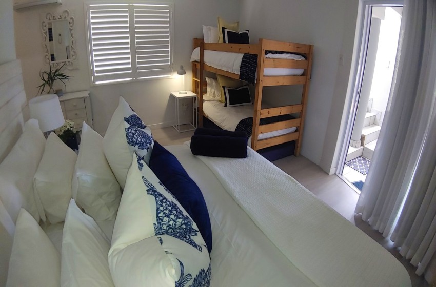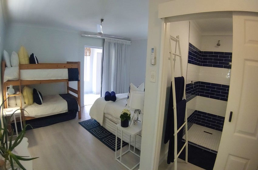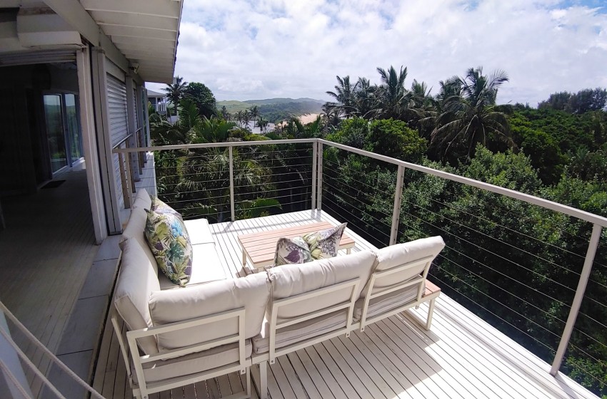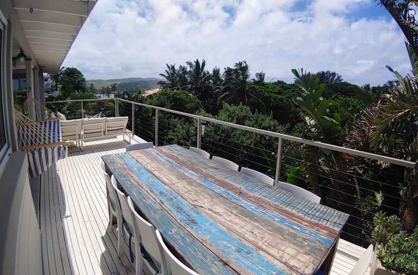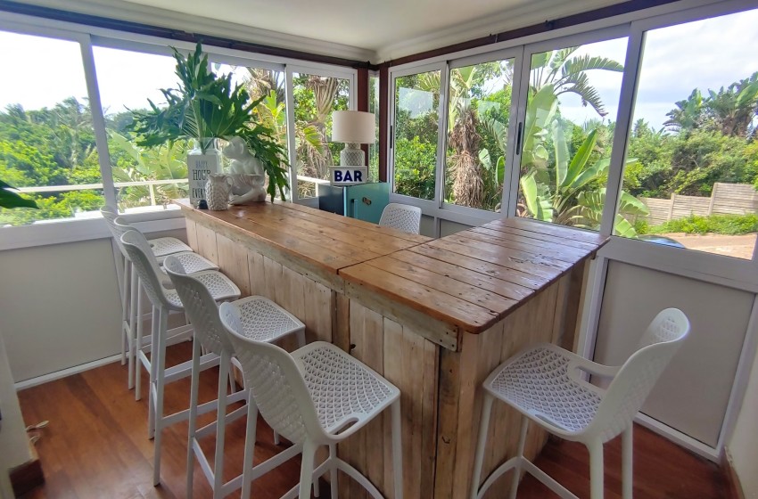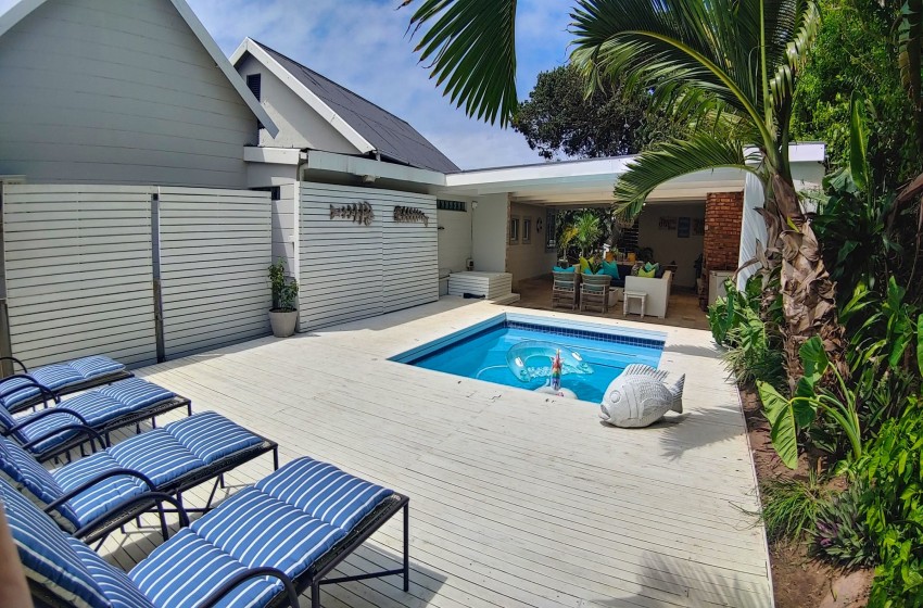 Type: Self-Catering Bedrooms: 4 Bathrooms: 4 Capacity: 15 (9 adults, 6 children under 10 years) Features: Air-Con, Pool, Walking distance to Beach, Wi-Fi, Smart TV Happy Hideaway: A Relaxed Coastal Vibe Happy Hideaway in Zinkwazi is exactly what its name suggests – a cheerful coastal home where relaxation comes naturally. Tucked away in a beautiful setting, this home is perfect for families and friends wanting to enjoy a beach holiday with all the comforts of home. This 15 sleeper, double storey home offers everything you need for a carefree stay and accommodates up to 9 adults and 6 children (under 10 years) in 4 x air-conditioned bedrooms, each with an en-suite bathroom, as well as a guest toilet. Two bedrooms are located upstairs, while the other two are on the ground floor. Bed Configuration Bedroom 1 - King Bed Bedroom 2 - 3 x Single Beds Bedroom 3 - King Bed, 2 x Bunk Beds (Downstairs) Bedroom 4 - Queen Bed, 1 x Bunk Bed (Downstairs) The open plan kitchen is fully equipped for self catering and sufficient cutlery, crockery, cookware & glassware for 15 people. Kitchen/Catering Equipment 2 x Fridge/Freezers Stove & Oven Microwave Air Fryer Nespresso Machine Dishwasher Gas Weber The living area at Happy Hideaway features comfortable seating, a Smart TV and a bar with a bar fridge. This space opens seamlessly onto a wooden deck furnished for outdoor relaxation with scenic views of the surroundings. High-speed Wi-Fi is available and an inverter provides backup power for plugs and lights during load-shedding. With its spacious layout, family-friendly amenities and relaxed coastal vibe, Happy Hideaway is the perfect setting for an unforgettable family holiday.