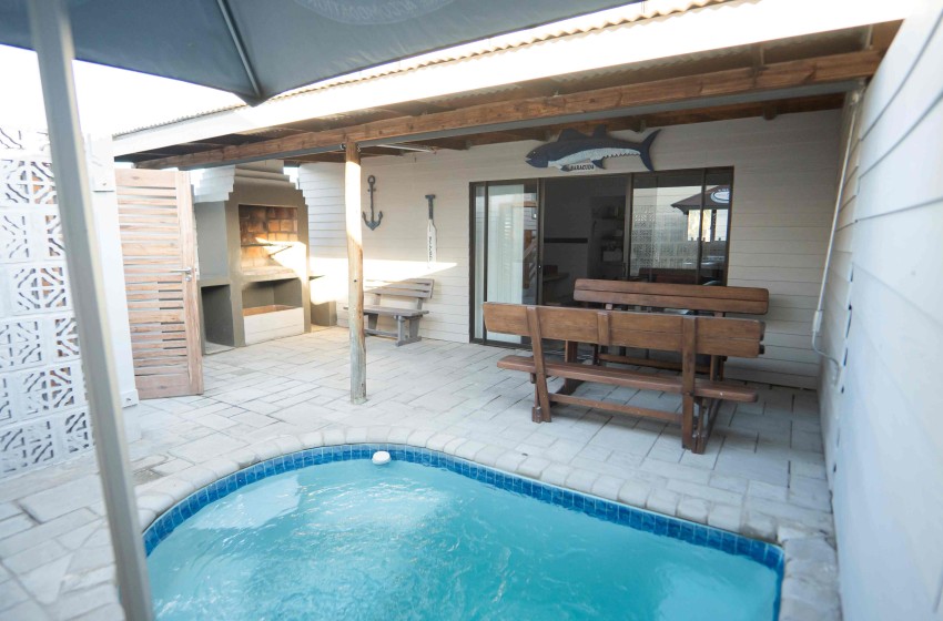 Type: Self-Catering Bedrooms: 3 Capacity: 6 Guests Bathrooms: 2 Features: Air Con, DSTV, Pool, On the Beach, Wi-Fi Tuna House: The Essence of a Tranquil Beach Holiday in Barradise! Tuna House is a 3 bedroom double-storey house situated on Barra Beach, in the popular Barra 5 complex. This cosy gem is located at the back of the property, but offers sea views from the upstairs bedroom. Tuna House comfortably sleeps 6 people. An additional two children under 12 years can be accommodated on mattresses at additional cost. The 3 bedrooms are air-conditioned and each has a Super King size bed (which can be moved apart to form 2 x 3/4 beds). The main bedroom with an en-suite bathroom is located downstairs, the other 2 bedrooms are upstairs and share a bathroom. The cosy living area comprises an open plan kitchen and lounge area with DSTV. Glass sliders lead to the outside patio. Here you'll find a splash pool, a charcoal barbeque and bench style dining furniture to cater for those mouth-watering seafood feasts. Wi-Fi is provided for your convenience, as well as a daily cleaning service. Experience the allure of Barra with its pristine white sands, gently swaying coconut palms, and the crystal-clear turquoise waters - the essence of a perfect holiday. Relax and experience the allure of Barra with its silken white sands, gently swaying coconut palms the the crystal-clear turquoise waters - the essence of a tranquil beach holiday in Barradise!