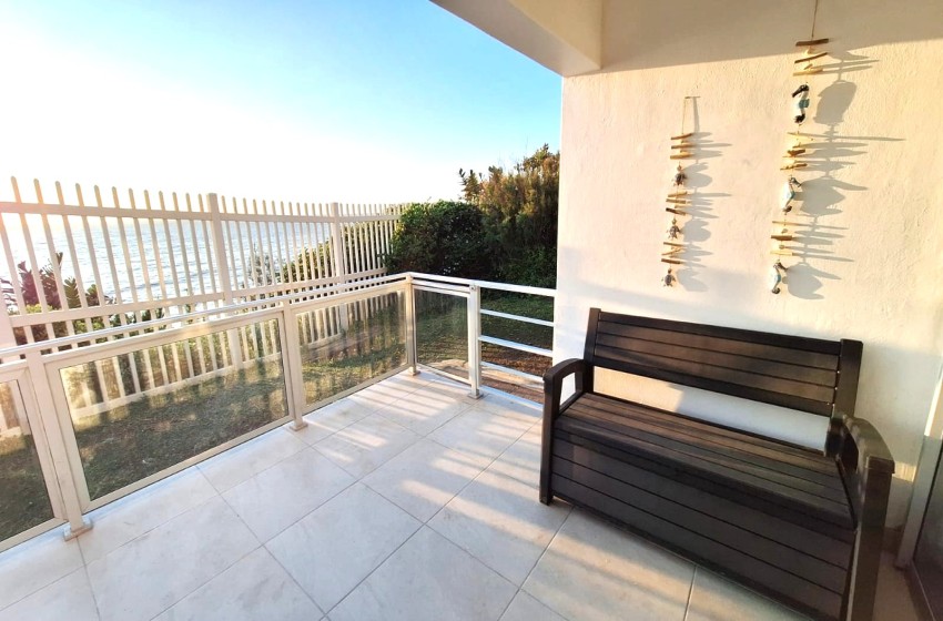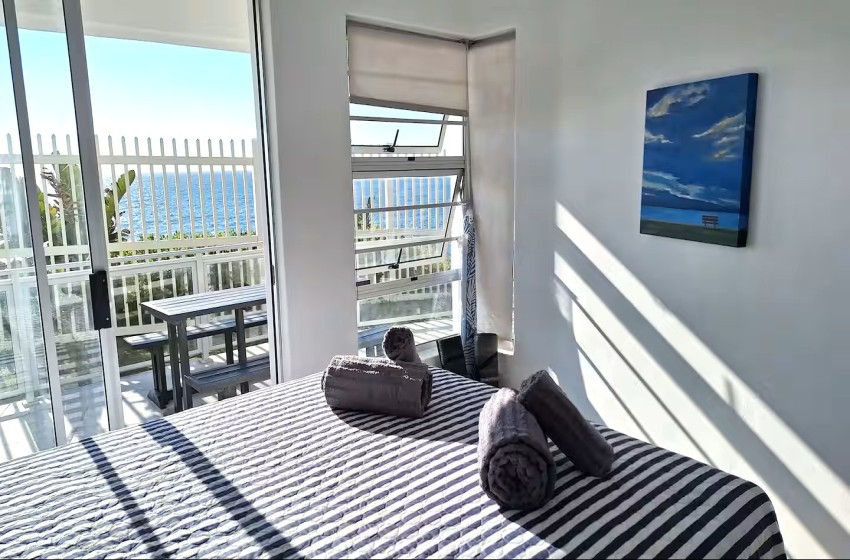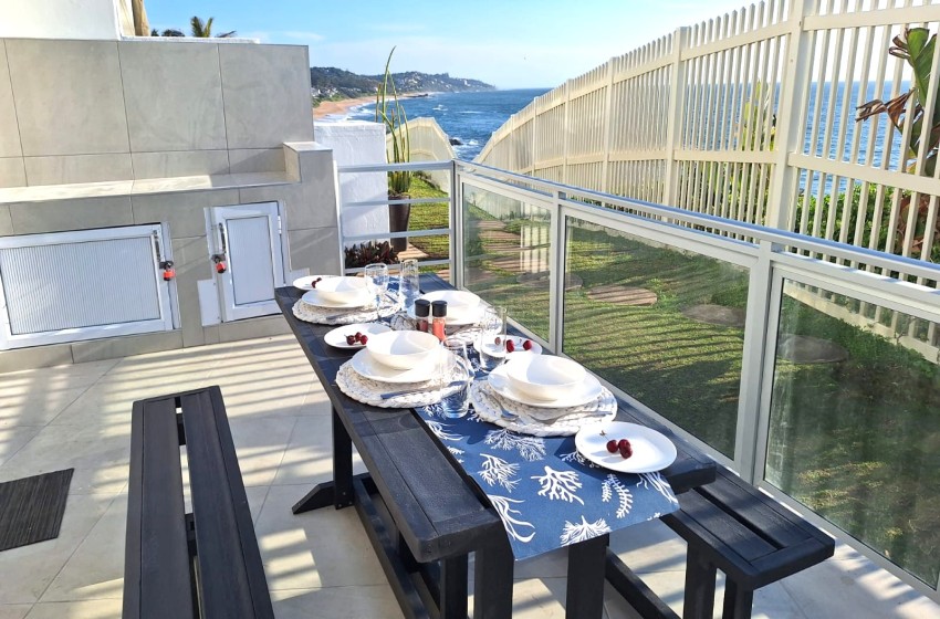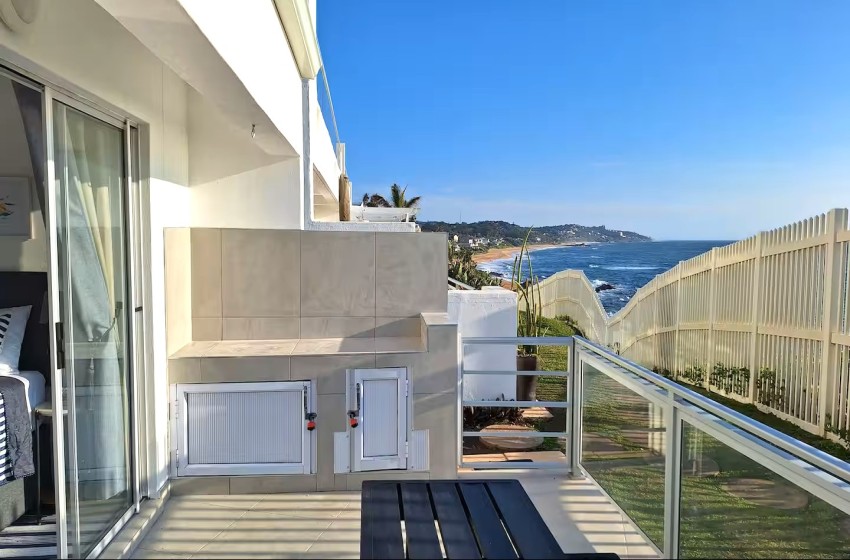 Type: Self-Catering Bedrooms: 1 Bathrooms: 1 Capacity: 4 (2 adults and 2 children under 12 years on sleeper couch) Features: Sea Views, Direct Beach Access, Air-Con, Complex Pool, Wi-Fi Pearl Rock Ballito Beach Cottage: Cosy Couples Cottage Pearl Rock is a cosy beachfront unit located in Shaka’s Rock, Ballito, perched on rocky outcrops above the tranquil blue ocean. This stylishly decorated self-catering beach cottage features an air-conditioned bedroom with a queen bed, a full bathroom, and an open-plan living area with a sleeper couch and Smart TV in the lounge. The fully equipped kitchen includes a washing machine for added convenience. The living area opens onto a spacious patio overlooking the coastline, furnished with a dining table and chairs — the perfect spot to relax and enjoy the beautiful coastline. Kitchen Catering/Equipment Gas Stove & Electric Oven Microwave Oven Fridge/Freezer Kettle & Toaster Nespresso Coffee Machine Gas Braai Washing Machine Crockery/Cutlery/Utensils Pots/Pans Glassware & Mugs A serving counter with a gas Weber braai is located on the patio, ideal for relaxed outdoor meals. A storage bench provides hammocks for lazy afternoons, as well as a beach umbrella and toys for children to build sandcastles by the sea. The unit has direct access to the beach and guests are welcome to enjoy the communal pool. Pearl Rock Ballito Beach Cottage offers a relaxed coastal escape in one of Ballito’s most loved seaside spots. It’s the perfect setting for couples or small families looking to enjoy the beauty of the North Coast.