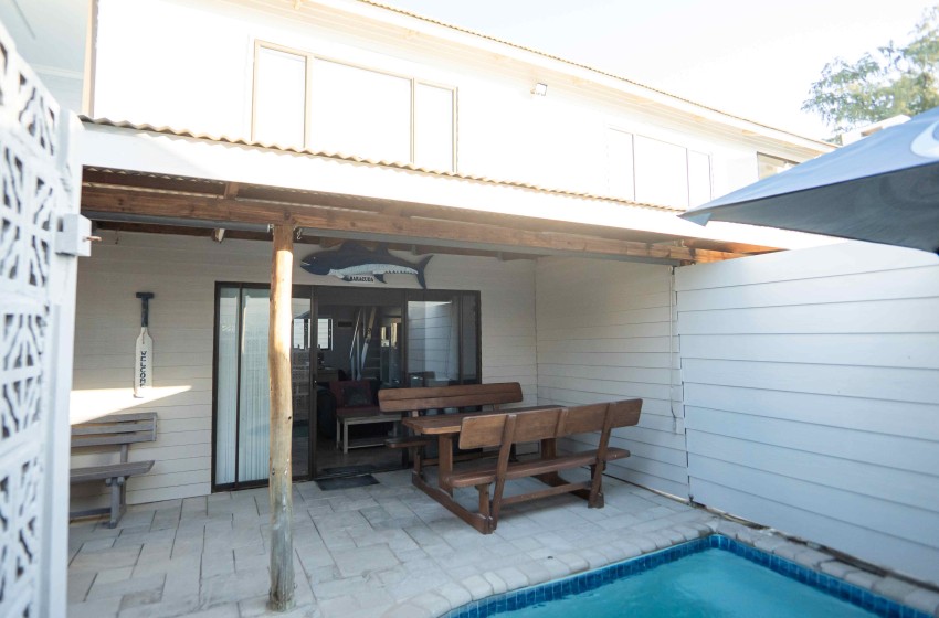 Type: Self-Catering Bedrooms: 3 Capacity: 6 Guests Bathrooms: 2 Features: Air Con, DSTV, Pool, On the Beach, Wi-Fi Tuna House: The Essence of a Tranquil Beach Holiday in Barradise! Tuna House is a 3 bedroom double-storey house situated on Barra Beach, in the popular Barra 5 complex. This cosy gem is located at the back of the property, but offers sea views from the upstairs bedroom. Tuna House comfortably sleeps 6 people. An additional two children under 12 years can be accommodated on mattresses at additional cost. The 3 bedrooms are air-conditioned and each has a Super King size bed (which can be moved apart to form 2 x 3/4 beds). The main bedroom with an en-suite bathroom is located downstairs, the other 2 bedrooms are upstairs and share a bathroom. The cosy living area comprises an open plan kitchen and lounge area with DSTV. Glass sliders lead to the outside patio. Here you'll find a splash pool, a charcoal barbeque and bench style dining furniture to cater for those mouth-watering seafood feasts. Wi-Fi is provided for your convenience, as well as a daily cleaning service. Experience the allure of Barra with its pristine white sands, gently swaying coconut palms, and the crystal-clear turquoise waters - the essence of a perfect holiday. Relax and experience the allure of Barra with its silken white sands, gently swaying coconut palms the the crystal-clear turquoise waters - the essence of a tranquil beach holiday in Barradise!